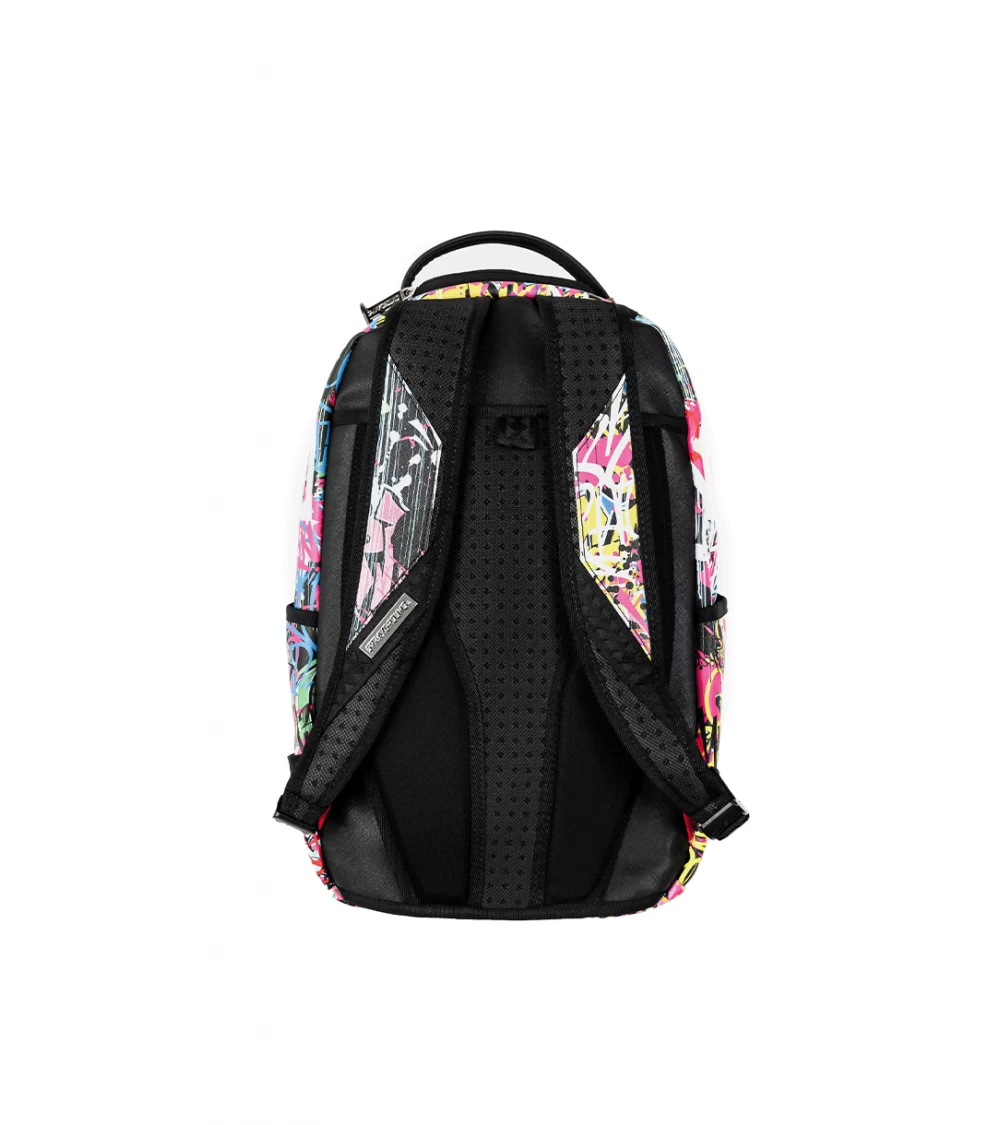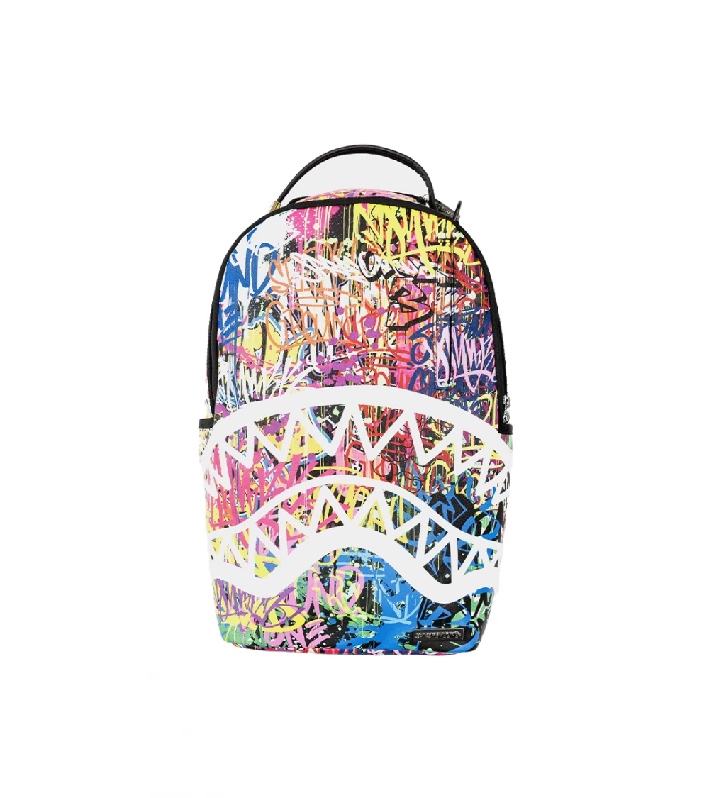 Here comes the new Sprayground Spring Summer 2024 collection: we present the Le Mens Backpack featuring printed graffiti in different colours and the ever-present shark mouth. This edition’s backpack retains the classic structure with handle, adjustable padded shoulder straps and ergonomic back for a comfortable fit. Embellished with metal hardware, it consists of a zipped main pocket, velvet top compartment for glasses, side water bottle pockets and a hidden front pocket. The nylon-lined interior houses a laptop compartment and various organiser pockets to keep small items in place. Logo insert on metal plate applied to the bottom and left shoulder strap.