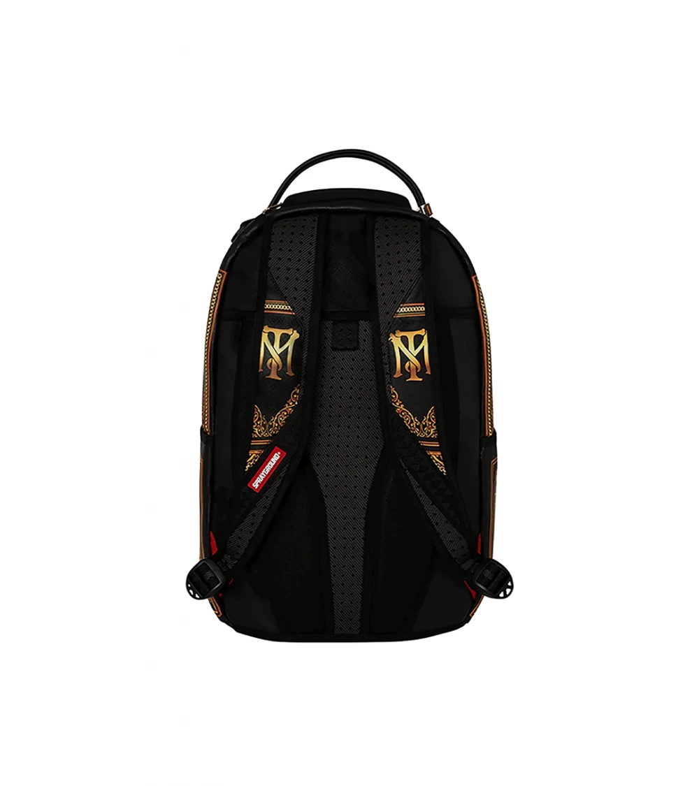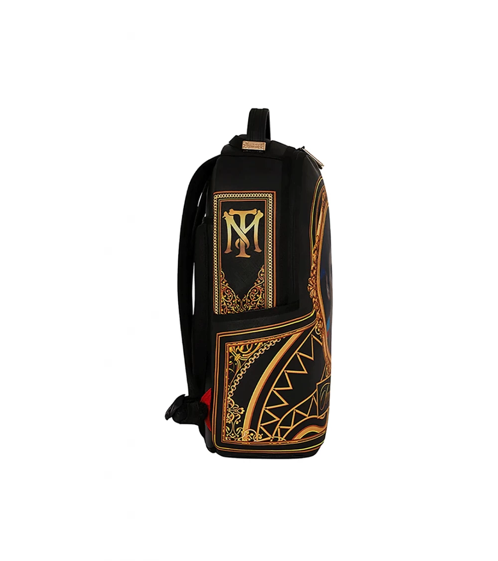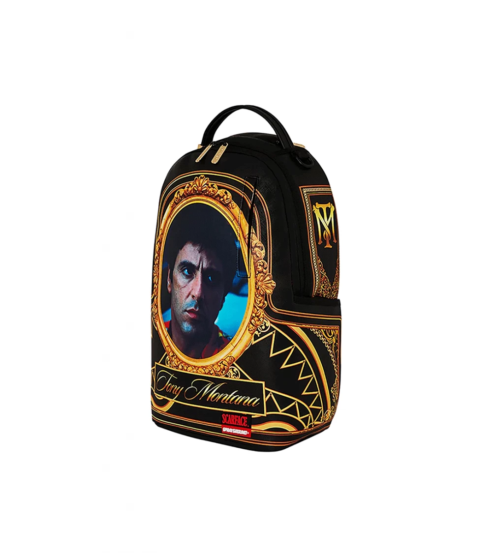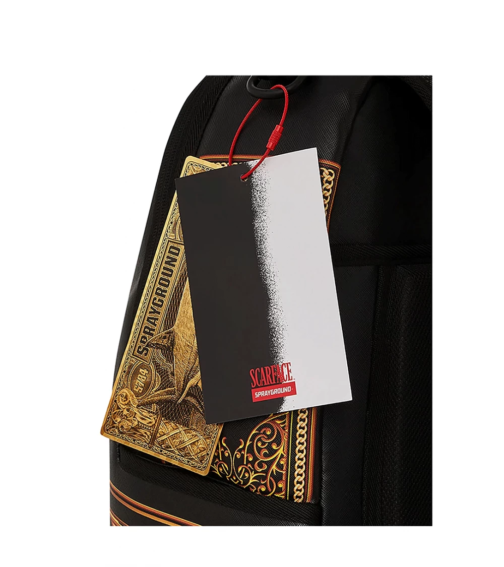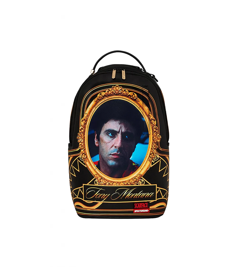 Here comes the new Sprayground Spring Summer 2024 collection: we present the Tony Montana Scarface Backpack with a super special design dedicated to the famous movie. This edition’s backpack retains the classic structure with handle, adjustable padded shoulder straps and ergonomic back for a comfortable fit. Embellished with gold-plated metal hardware, it features a zipped main pocket, velvet top compartment for glasses, side water bottle pockets and a hidden front pocket. The nylon-lined interior houses a laptop compartment and various organiser pockets to keep small items in place. Logo insert on metal plate applied to the bottom and left shoulder strap.
