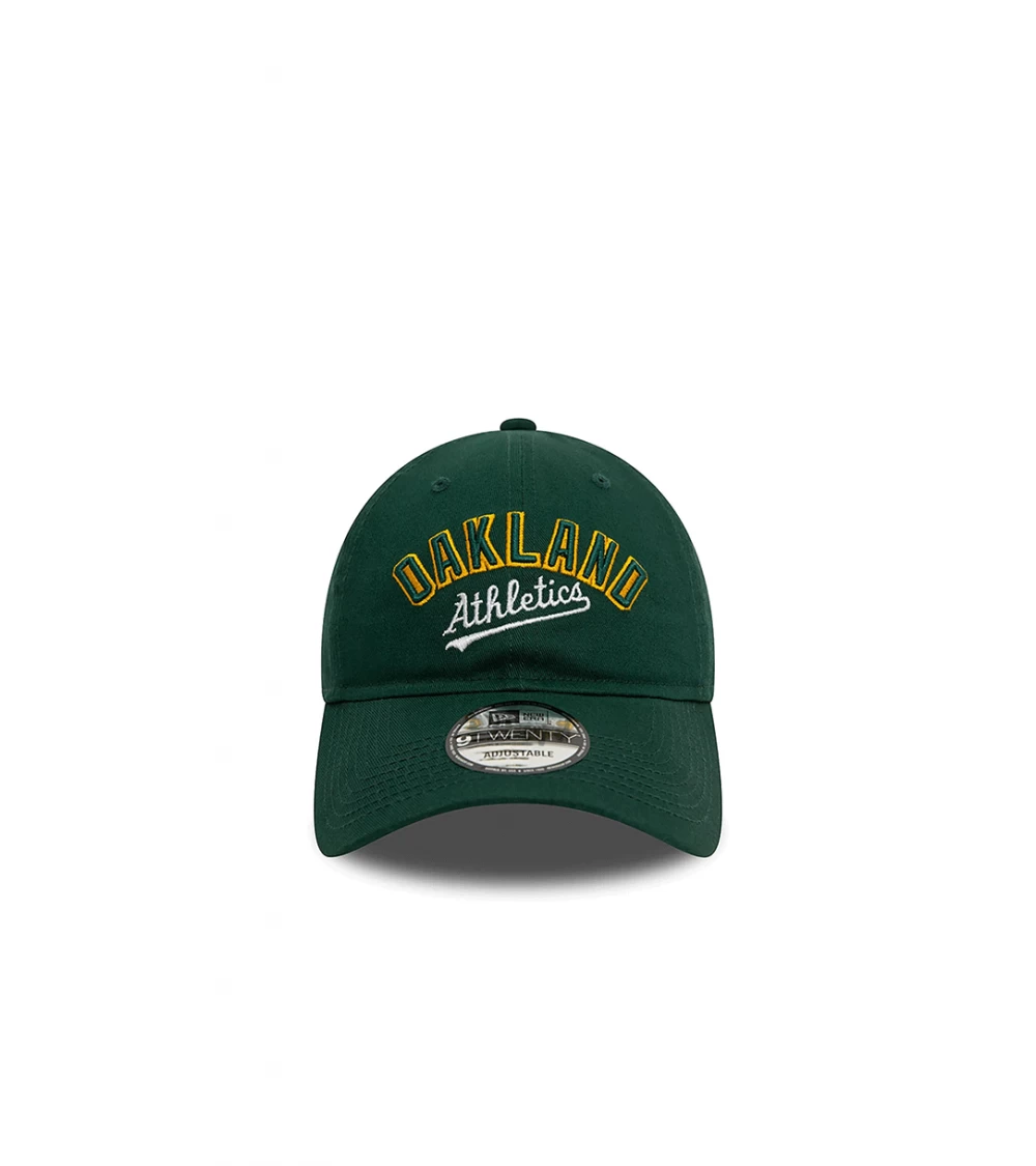New Era hat from the new Spring/Summer 2024 collection: deconstructed crown and slightly curved visor, cotton fabric and stitching on the side with New Era flag logo. Adjustable back strap and coloured stitching on the front dedicated to the Oakland Athletics.