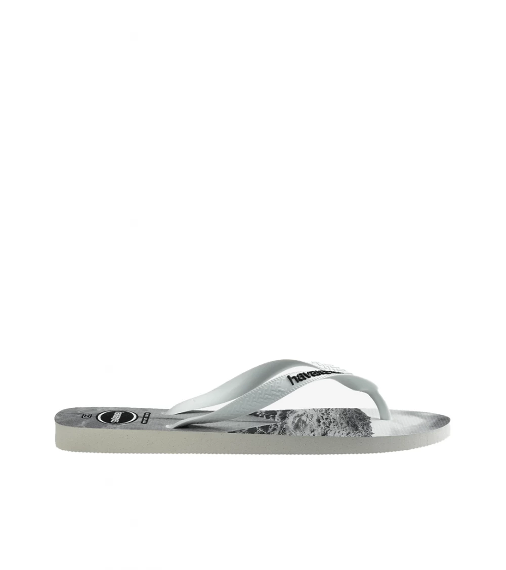 100% Made in Brazil soft rubber flip-flop with logoed strap and photographic print of one of Brazil’s paradise beaches. Silhouette featuring a non-slip rubber sole with a rice-grain pattern on top and a brick-patterned structure on the underside.