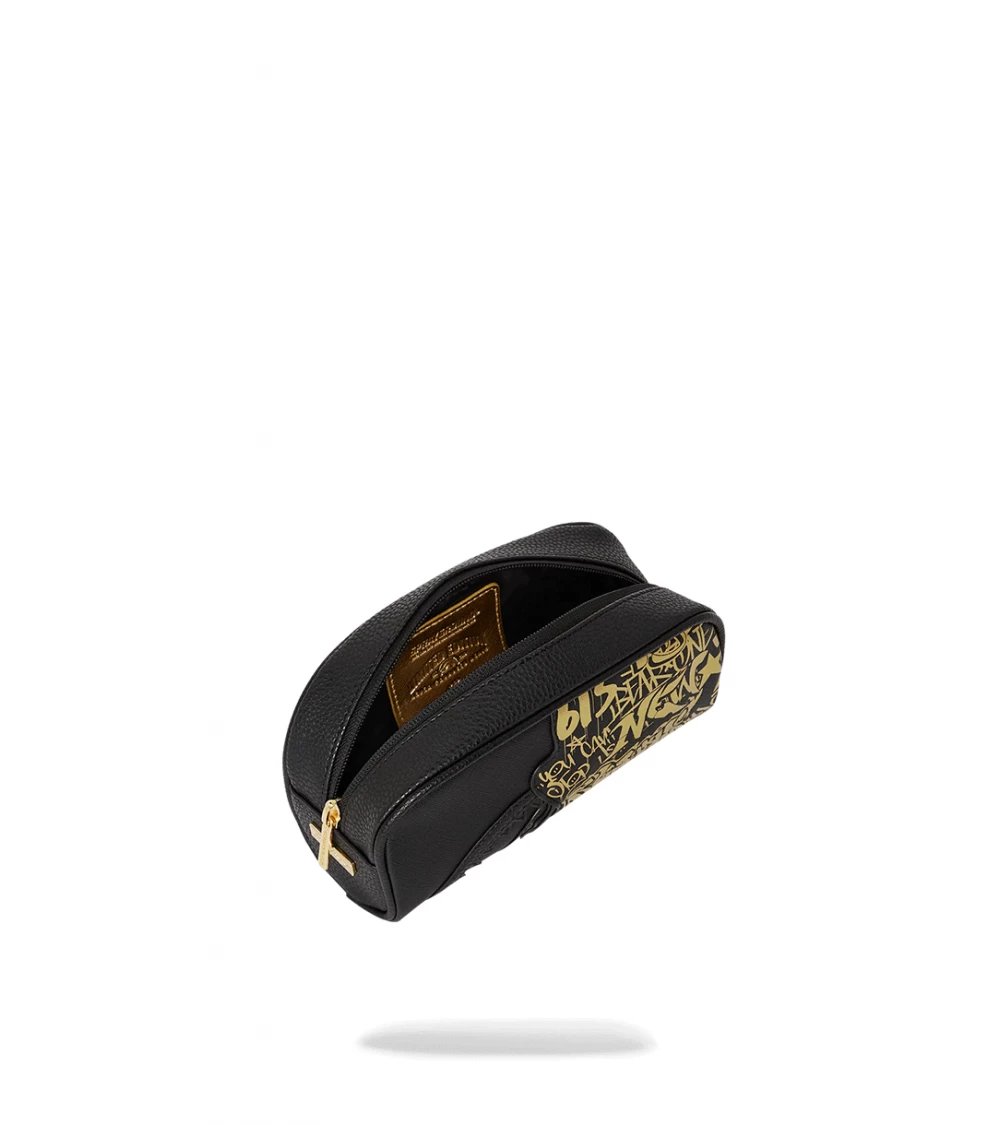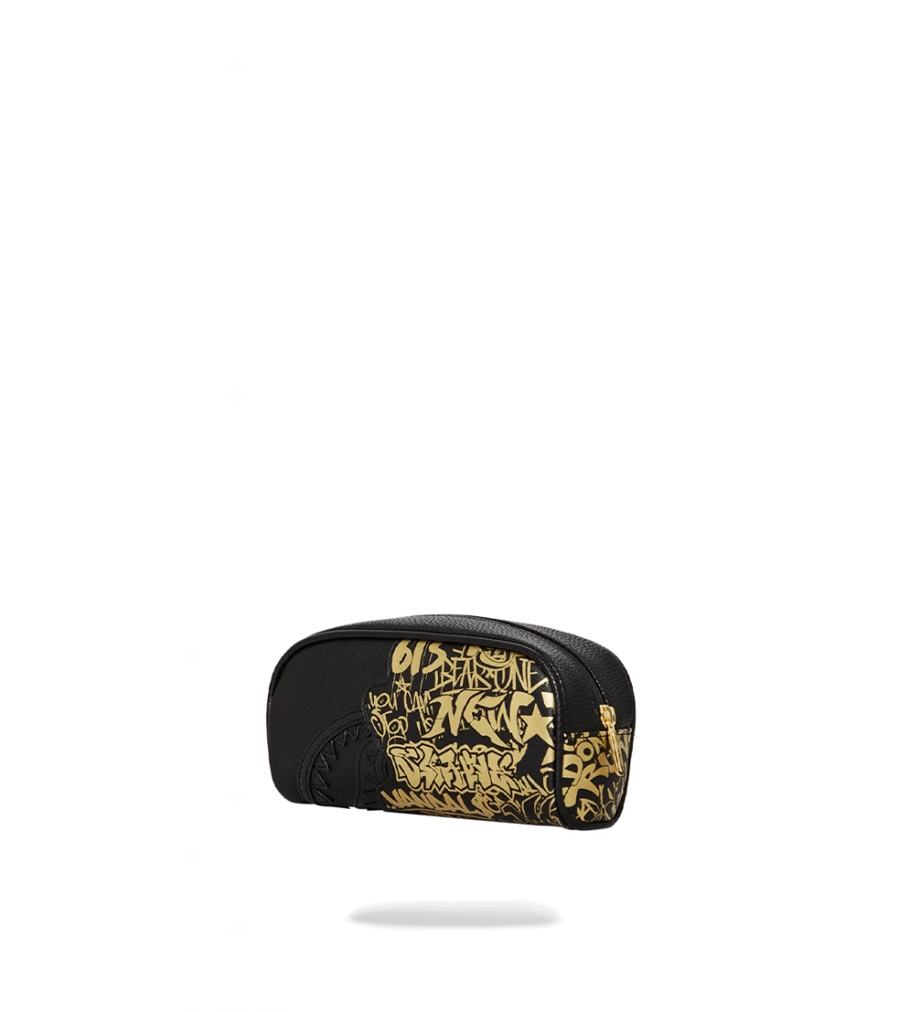 The Half Graff Clutch Bag is ideal for storing small items, pencils or even make-up products. Made of vegan leather with a black base and golden graffiti, and the brand’s distinctive and iconic shark mouth. Zip closure and metal hardware. Sprayground label stitched on the inside.