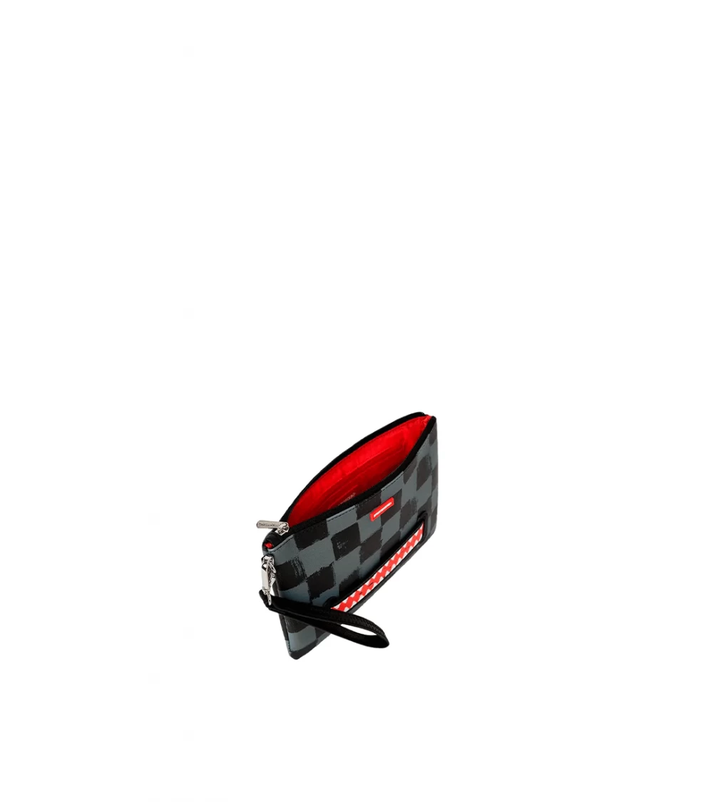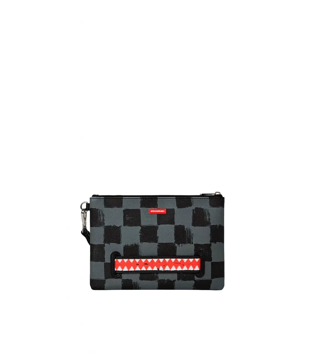 For fans of Sprayground accessories comes the new clutch bag, featuring a print of the classic black and grey check pattern and printed Shark Bite motif. This capsule clutch bag, made of saffiano-type vegan leather, consists of a zipped main pocket. The nylon-lined interior houses a small zipped compartment. The fit can be customised thanks to the removable wrist strap and the handle attached to the back panel.