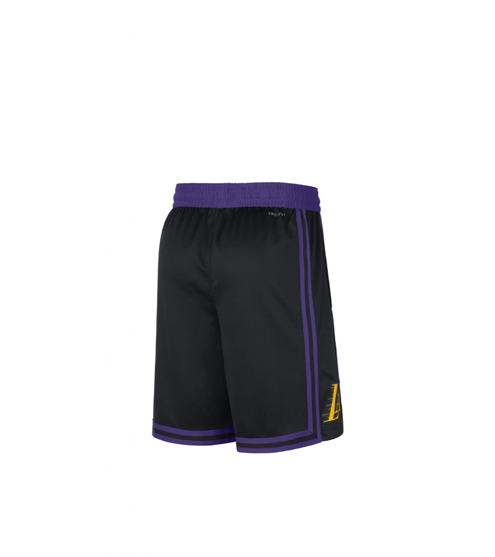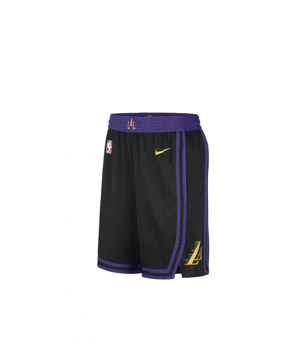 The City Edition shorts of the Lakers 23/24 fully represent the basketball team through the colours with which it is made: black symbolises the uncertainty felt by the players who have just arrived in L.A., purple recalls the first Californian sunsets and yellow is the symbolic colour of the team. The garment incorporates the NBA, Nike and Lakers logos on the side several times. Dri-Fit technology wicks sweat away, allowing it to evaporate.