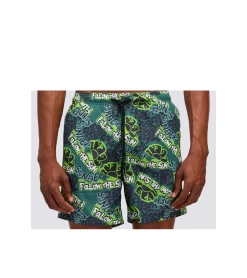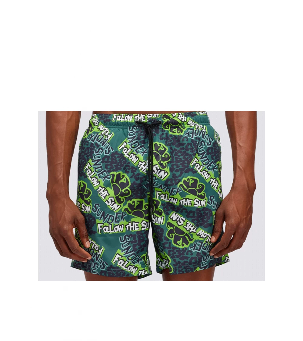 Sundek swimming trunks in the classic boxer cut to long length version, in an intense colour with adjustable drawstring waist. On the back we find the classic pocket with Velcro closure with the Sundek logoed rubber patch and military-coloured prints all over the surface with ‘follow the sun’ lettering, the brand’s motto. Quick-drying, use of recycled materials.